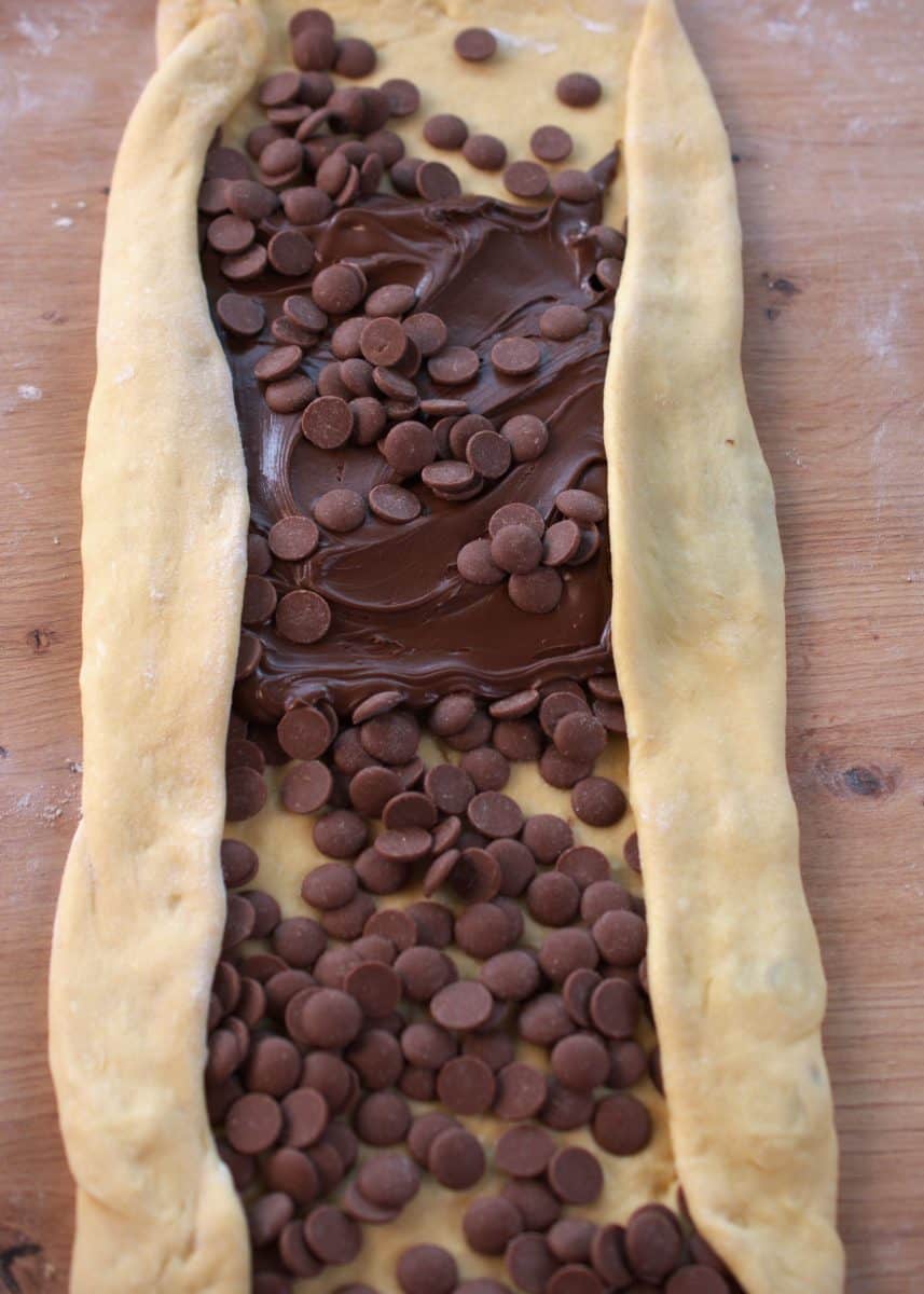 - Roll out the dough pretty thin, using a rolling pin. Spread ¾ cup (220 g) Nutella all over the dough in the middle of the dough, then add 1 cup (150 g) of milk chocolate callets or chocolate chips all over the dough. Fold the sides slightly over the dough to avoid any Nutella or chips leaking. Starting from your side, roll the dough into a thick log.