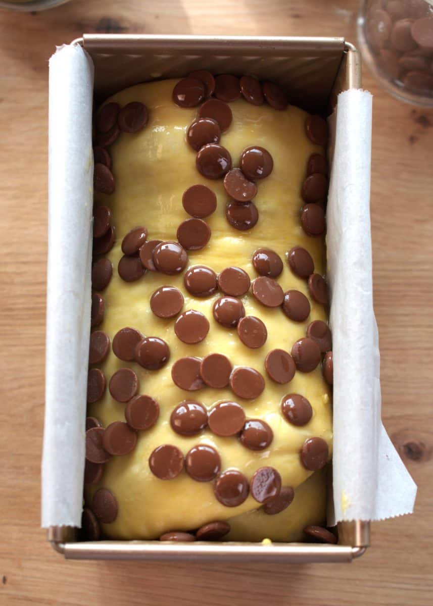 - Use a rectangular bread pan and line it with parchment paper to avoid any chocolate getting stuck on the pan. Place the dough inside and let it proof for 45 more minutes.