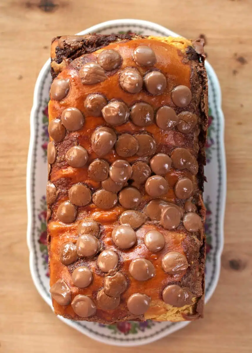 Some of the chocolate will probably escape from the sides so I recommend you use a prepared pan with parchment paper, this way the chocolate will not get stuck into the pan and also possibly sticking the loaf to the pan with it.
