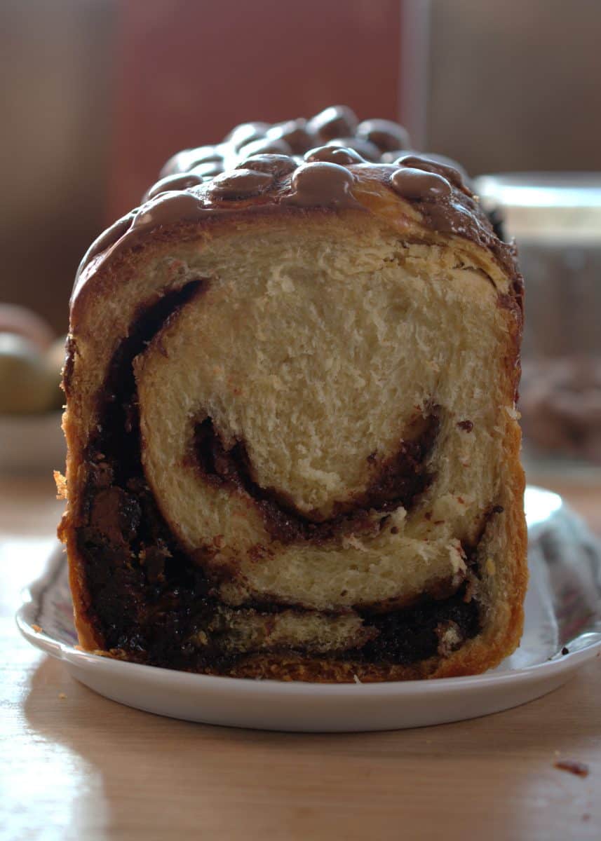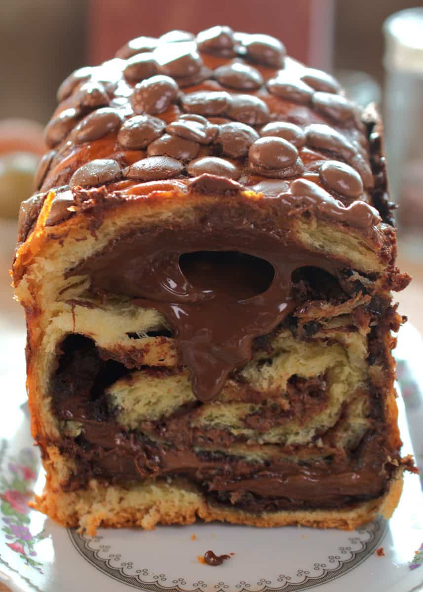 Delicious Nutella brioche loaf. Covered in chocolate chips, filled with Nutella. It has a soft and fluffy texture.