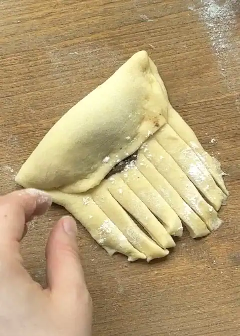 - On the other half (the unfilled side), cut thin strips, then carefully wrap and twist them over the filled portion, creating a braided or woven effect.