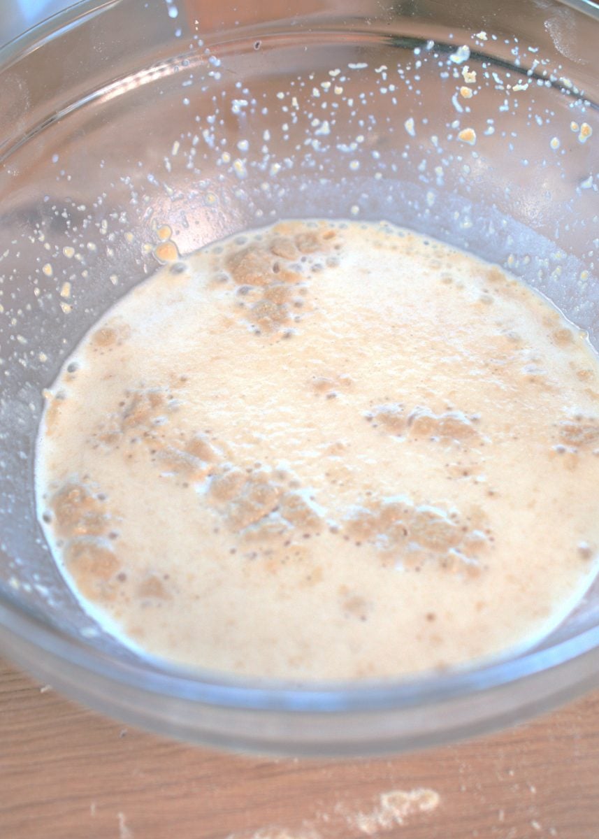 To activate the yeast, we mix it with warm (not hot!) milk and sugar. After 10-15 minutes, you should see bubbles or foam on the top.