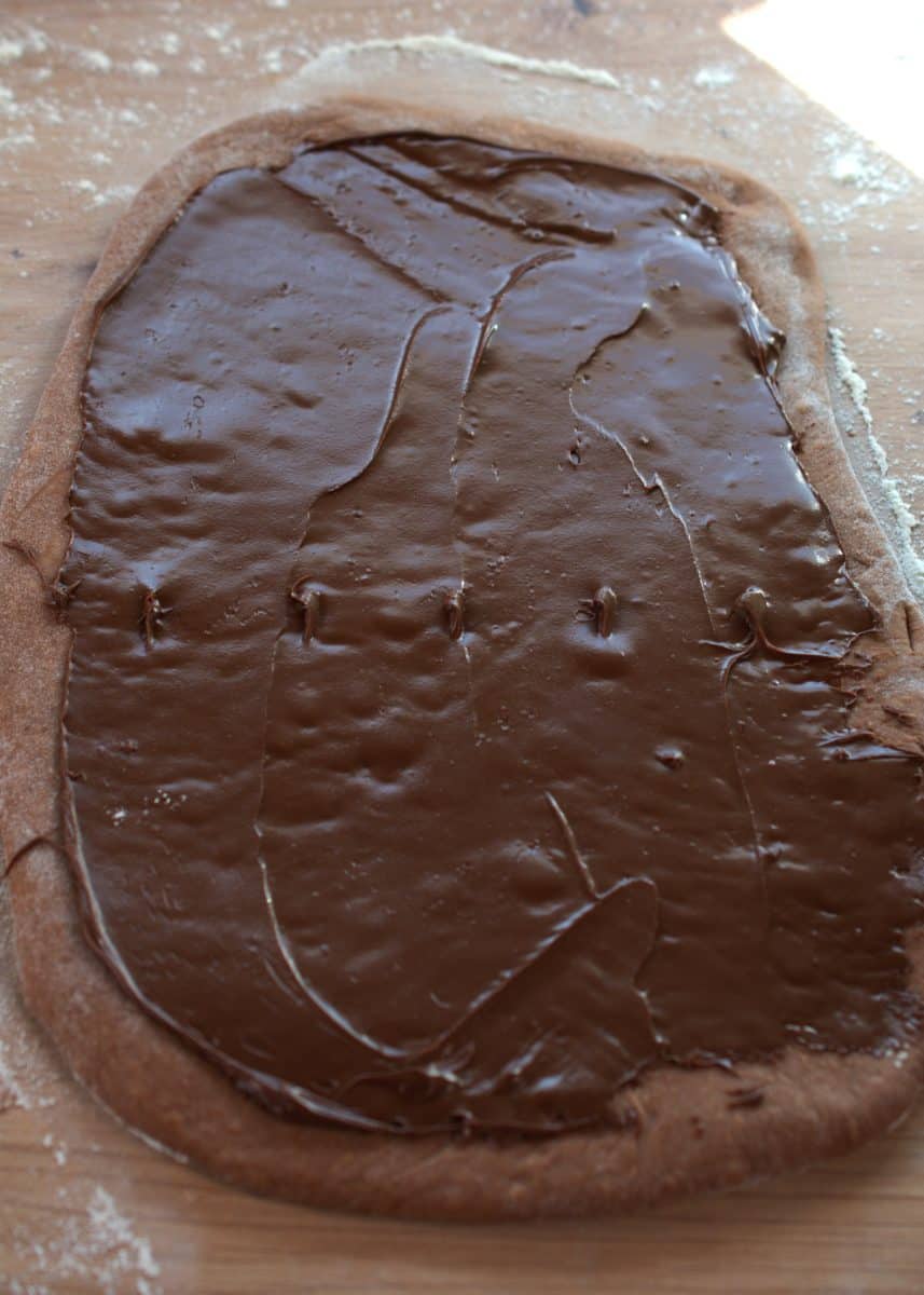 5. Place the dough on a slightly floured surface and roll it out the dough. Spread ¾ cup (220 g) Nutella. If the Nutella is cold, I recommend you microwave it slightly so it’s easier to spread without breaking the dough. Make sure not to don’t fully melt it, just enough to be able to spread it.