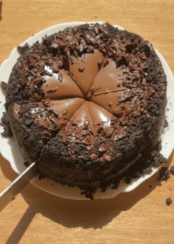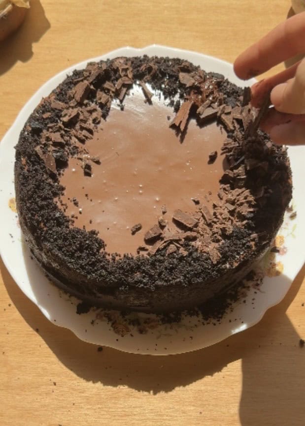 Once the cheesecake is set, you can decorate it by melting extra Nutella, add chocolate chunks and Oreo crumbs.