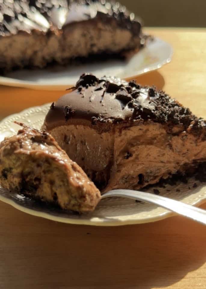 • Drizzle the melted Nutella over the top, tilting the pan slightly to spread it evenly for a glossy finish. Crush a few Oreos and sprinkle them around the edges or on top for a beautiful and delicious decoration before slicing.