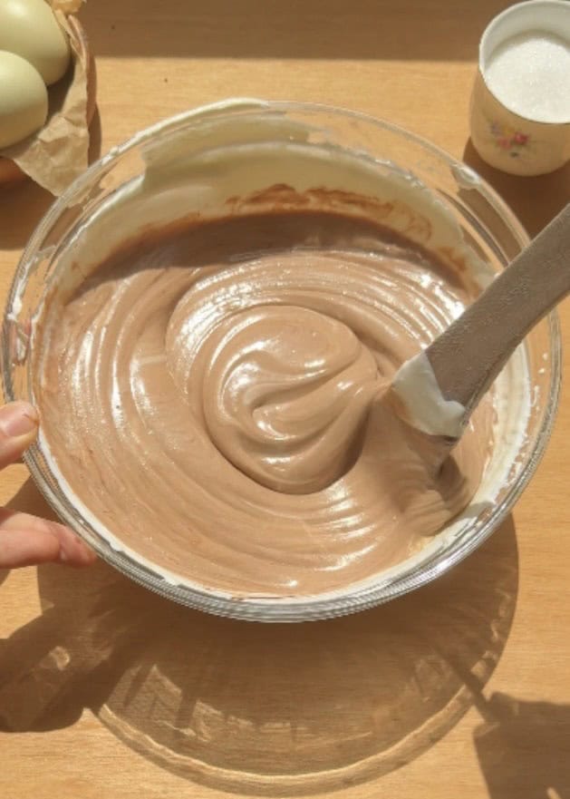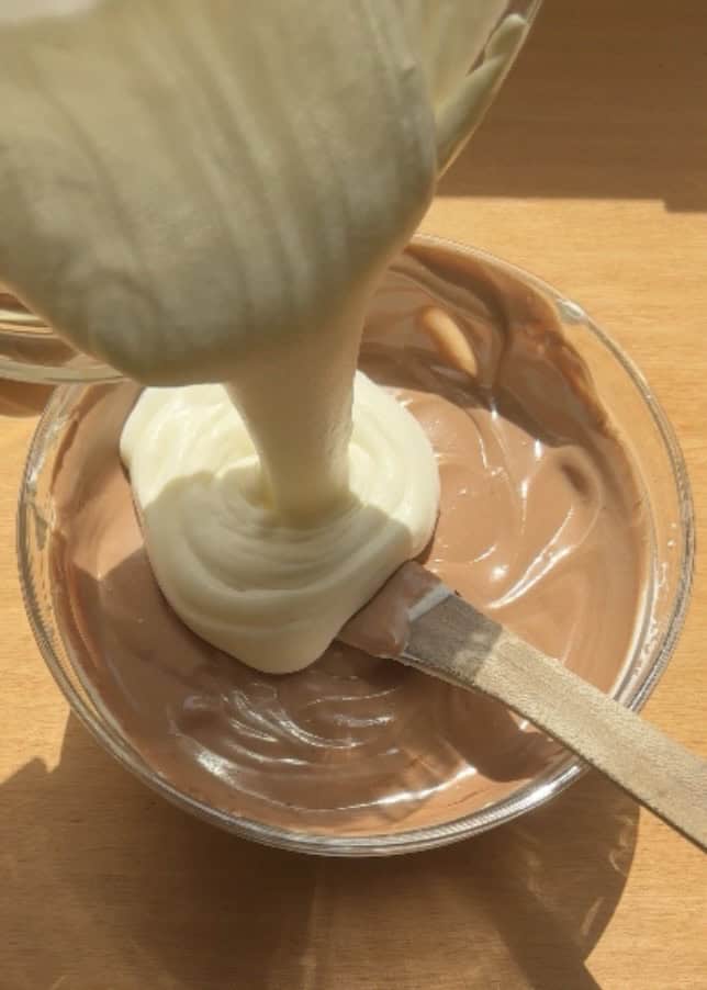 • Add half of the whipped cream into the Nutella cream cheese mixture. Gently fold it in with a spatula, turning the bowl as you go to keep the mixture airy. Once almost incorporated, fold in the remaining whipped cream until the filling is smooth and fluffy with no streaks.