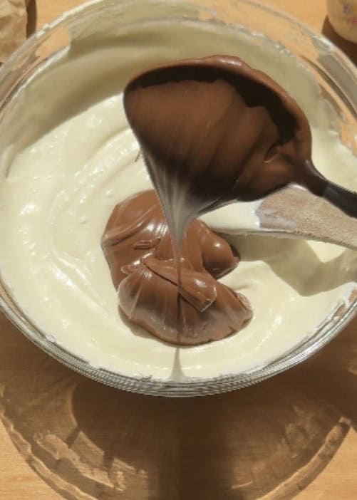 Gently fold the whipped cream into the Nutella cream cheese filling in two parts. Start by folding in half the whipped cream until almost fully incorporated, then add the remaining half.