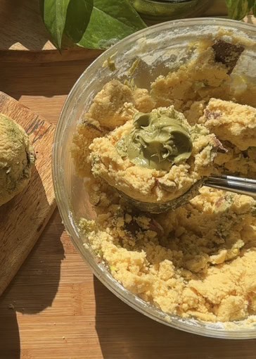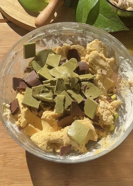 3. Gently stir chopped pistachios and chunks of the frozen pistachio spread and chocolate into the dough until evenly distributed, being careful not to overmix.