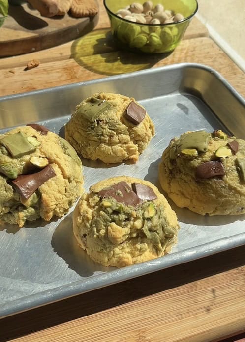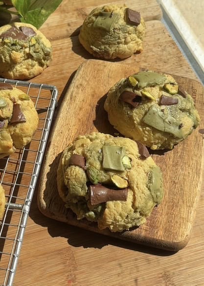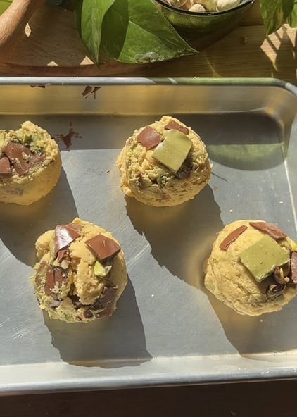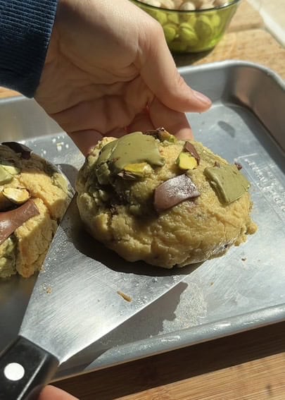 - Freeze pistachio spread solid before use: completely freeze your pistachio spread or butter before cutting and adding it to the dough – this prevents it from melting into the cookie during baking and helps maintain those perfect gooey pockets of flavor. For best results, spread the pistachio mixture thin on parchment paper before freezing so it breaks easily into chunks.
