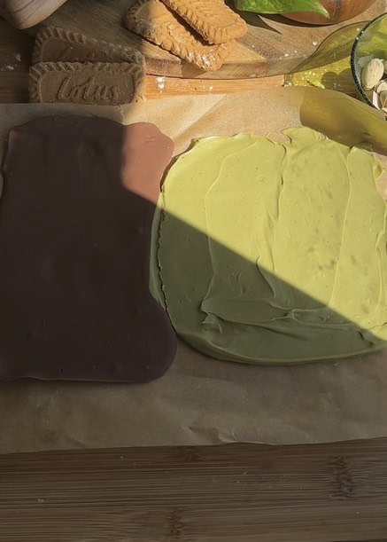 - Start by spreading a thin layer of melted pistachio butter and melted chocolate onto a parchment-lined pan, then freeze until solid