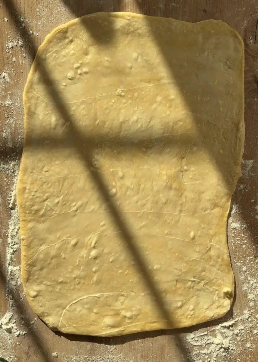 Once proofed, roll the dough out into a large rectangle and spread an even layer of butter over the surface.
