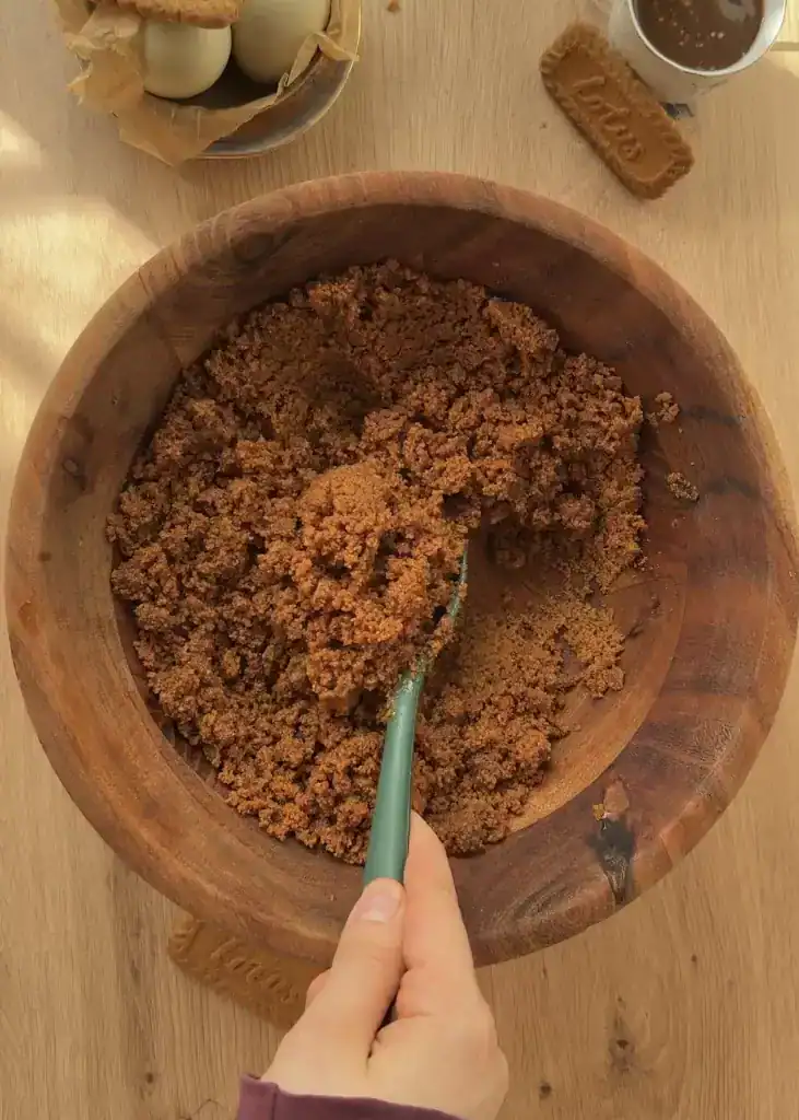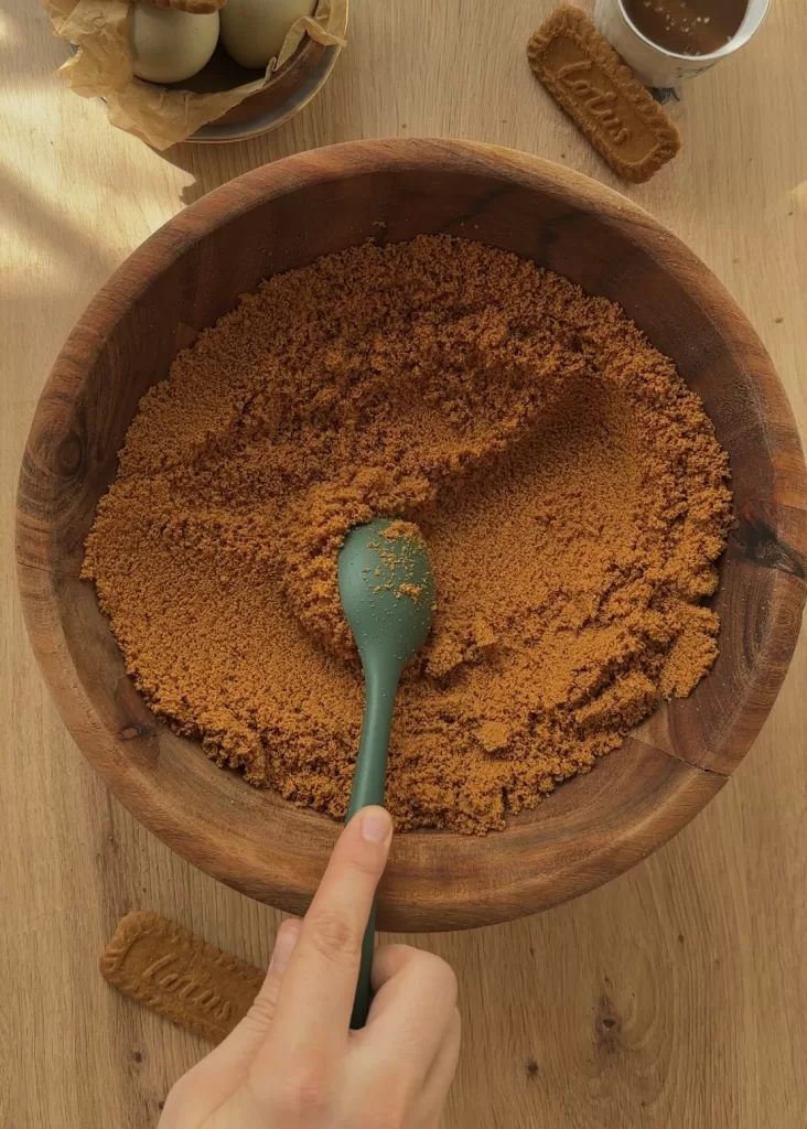 - Place the Biscoff cookies in a food processor and pulse until they are finely crushed, almost like sand. If you don’t have a processor, place the cookies in a ziplock bag and crush them with a rolling pin until very fine. Transfer the crumbs to a bowl, then add the melted butter and 1 tablespoon of caramel sauce. Mix well until all the crumbs are evenly coated and resemble wet sand.