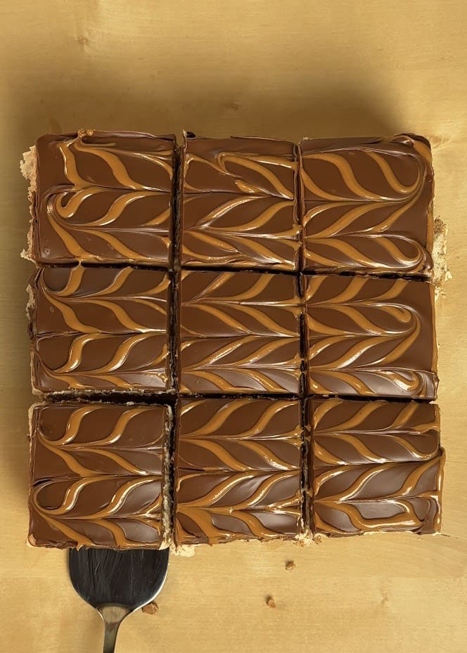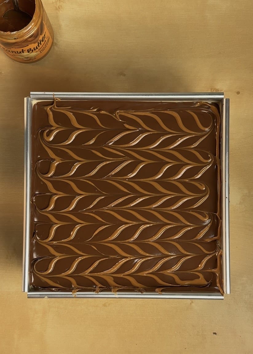 Once set, melt some Nutella and pour it all over the top. Grab a piping bag filled with peanut butter and pipe cute straight lines across the surface.