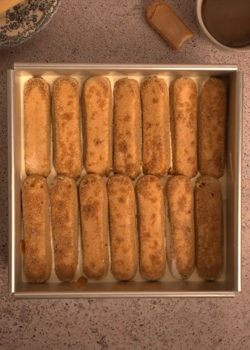 Begin by layering some coffee-soaked ladyfingers at the bottom of your dish.